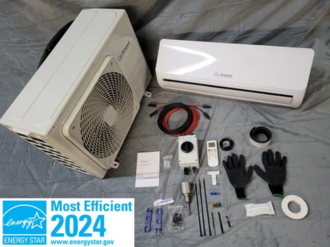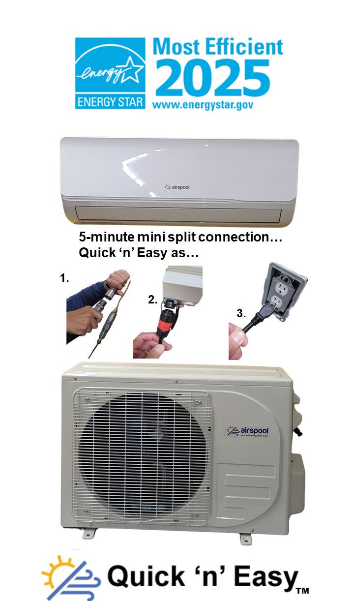 In stock! Get it in 1-5 days delivered. The world's fastest mini-split installation and 5-year guarantee! MS12 (12,000 BTU) Airspool Quick 'n' Easy solar air conditioner/heater. 5 minutes (literally) to connect everything. No HVAC tech needed.