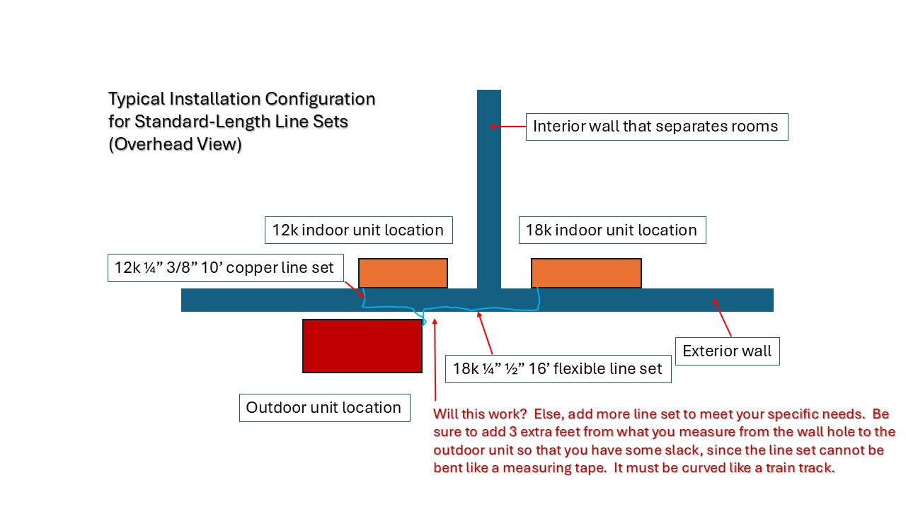 You've been asking for it, and here it is! This allows you to have cold (or warm) air in 2 different zones. The primary zone is 18,000 BTU and must be located within 15' of the outdoor unit, and the second zone is 12,000 BTU and must be located within 90' of the outdoor unit. Purchase your extended line set for the second unit here in increments of <50. ( For this 2nd indoor unit, measure the distance between this proposed 2nd indoor unit and your proposed outdoor unit location, and add 3 ft. then subtract 10'. Why? We recommend adding at least 3 extra feet onto your line set, since the line set must be curved line a train track, not bent like a measuring tape. So, a bit of extra won't hurt, but being too short is painful. Next, we provide you with 10' of line set with any unit, so subtract off this original 10'. Example: You measured 20'. Order 13' (20' + 3' extra - 10 ft. original). Got it? Example 2: You only need 7', because you are putting one indoor unit on one side of and internal wall (say, for a living room) and another unit on the other side of that internal wall (say, for a bedroom). 7 + 3 -10 = 0, so you won't need to order any extended line set. So, a recommendation in this case would be to have the outdoor unit aligned a bit more with the bedroom, and this way, you'll for sure be good for the 12k BTU unit and the 18k BTU unit, since the 18k BTU unit has 5 meters of line set (around 16' 5").